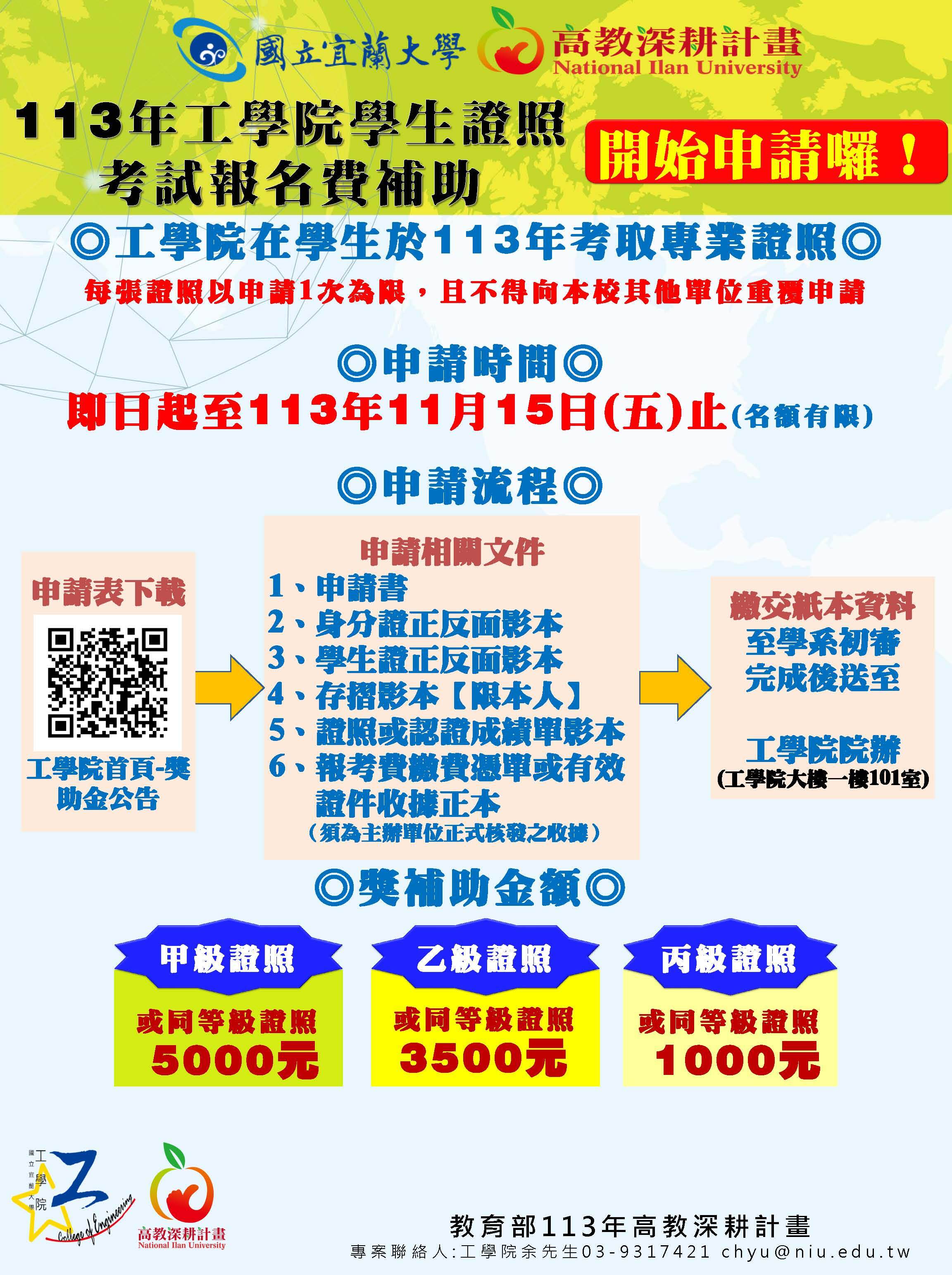 【工學院高教】=證照獎助金=113年工學院學生證照考試(檢定) 報名費補助辦法(名額有限申請至11/15(五))