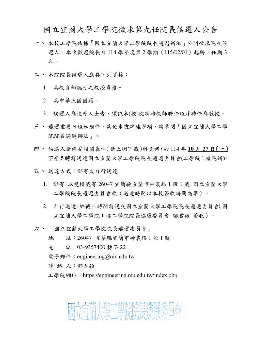 一、本校工學院依據「國立宜蘭大學工學院院長遴選辦法」公開徵求院長候選人。本次徵選院長自114學年度第2學期(115/02/01)起聘,任期3年。